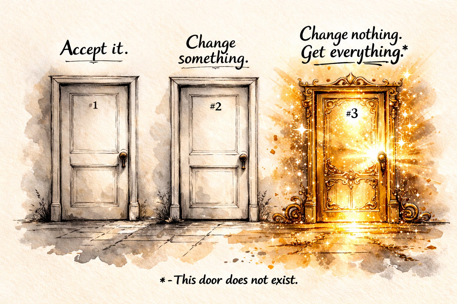 It’s door #3, which is the definition of insanity: change nothing, but expect different outcomes. That’s what most people experience as being stuck. Not from a lack of effort, but a refusal to eliminate imaginary options. And we do it because, as long as the hope of door #3 is alive, you never have to answer the hard question underneath it all… What am I actually willing to change?