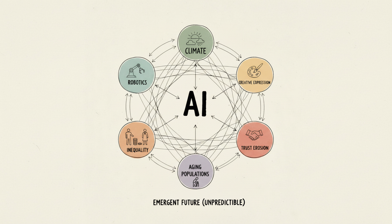 AI isn’t unfolding in a vacuum. It’s intersecting with robotics, nanotech, energy constraints, climate pressure, growing financial inequality, experiments with Universal Basic Income, political swings, aging populations in developed countries, and dozens of other massive trends.